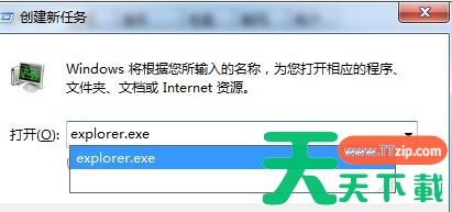 3、在弹出的任务对话框输入 explorer.exe 命令,点击确定,重新启动资源管理器。