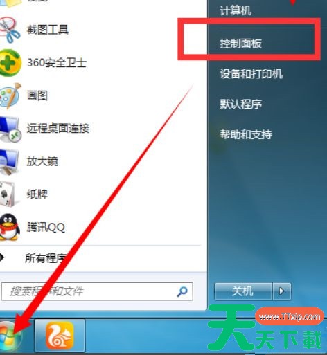 1、首先确保电脑是联网状态,之后在桌面的左下角找到“开始”并点击,弹出菜单之后找到并点击“控制面板”。