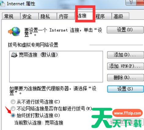 6、回到internet属性之后,选择“始终拨打默认连接”,即可。