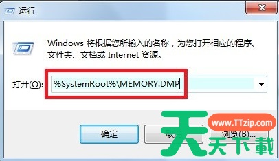 7、然后,在运行中粘贴路径:%SystemRoot%\MEMORY.DMP打开文件。