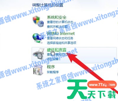 2、进入控制面板界面后,我们找到“硬件和声音’选项。