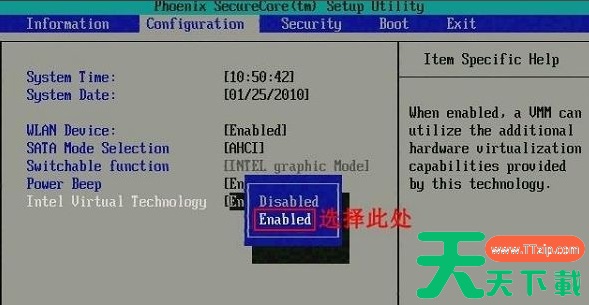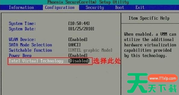 1、进入BIOS设置后,切换到“Configuration”选项,将光标移动到“Intel Virtual Technology”并按下回车,如果没有找到VT选项或不可更改,说明不支持VT技术。