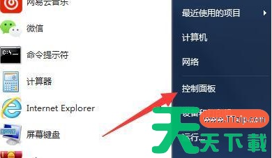 1、左下角点击开始菜单,选择“控制面板”打开。