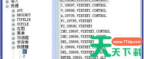 4、接着我们可以看到右侧的“C,28697,VIRTKEY,CONTROL”和“V,28698,VIRTKEY,CONTROL”,其中最后的“CONTROL”表示的是先按的键,最前面“C/V”是后按的键,我们只需要将它根据自己的需要进行更改就可以了。