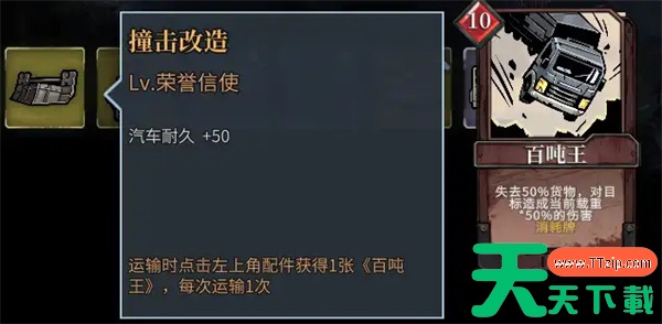 我们是一辆卡车,不是战车,而弓头鲸制造(大地图右下角的大避难所)的塞车支线最终奖励是配件【撞击改造】,每次运输可以点击右上角获得一张【百吨王】。