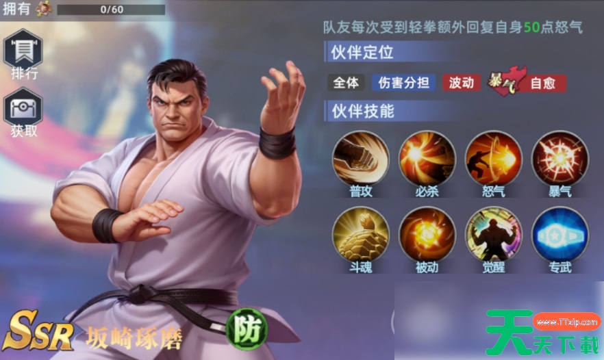 坂崎琢磨担任主坦角色,其必杀可实现单体无伤并回复自身生命值,怒气技具备多段伤害,并锁定目标使其在回合结束时承受额外超然伤害。当生命值低于特定比例时,暴气效果可自动恢复血量,2星被动“重拳”还能触发自动回血,增强生存能力。