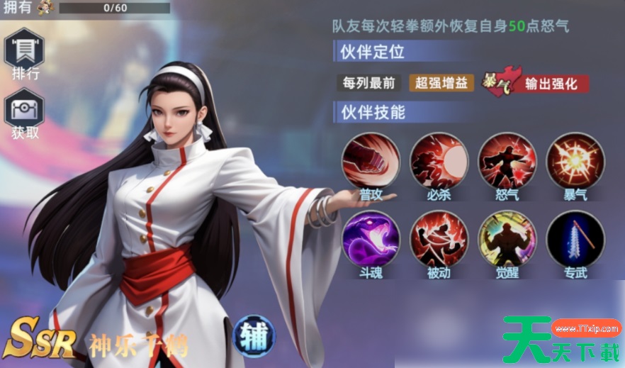此阵容以八神庵为核心输出,搭配草薙京进行伤害补充,辅以神乐千鹤的增益与库拉的怒气回复,实现短时间内的高爆发输出。八神庵的重击除攻击主目标外,还可随机追加一名目标造成能量伤害。其必杀为高倍率单体物伤,并降低目标最终免伤,暴气状态下提升自身最终伤害。怒气技优先攻击血量最低敌人,每多一名敌方单位则伤害递增。怒气释放后可牺牲自身10%最大生命值,换取基于已损生命值比例的最终伤害提升,并附加一定免伤效果,使其在残血时输出更为恐怖。