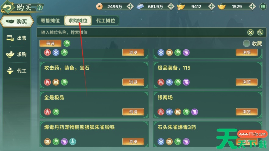 在泫渤派找到一个空位,设立自己的摆摊位置,即可进行摆摊,不管是打怪掉落、制造所得还是活动获取,都能用来进行交易,找寻别人的求购摊位,直接原地出售岂不美哉!
