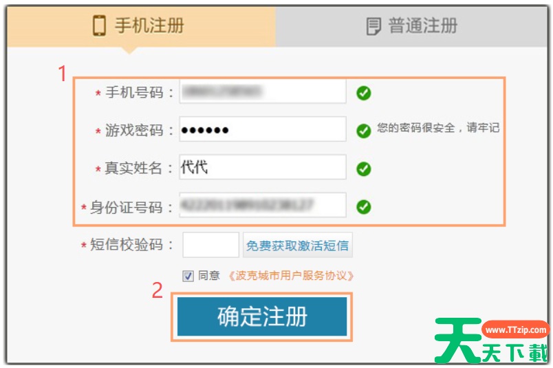 2、使用手机号注册:输入手机号、游戏密码、姓名、身份证号,获取并输入短信验证码,点击“确定”完成注册。