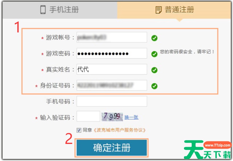 3、选择普通账号注册:设置喜欢的账号名(英文或数字),输入密码、姓名、身份证号和手机号,点击“确定”注册。