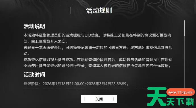 本活动将征集管理员们的游戏昵称与UID信息,以特殊工艺刻录在特制的协议源石模型内部,由卫星搭载升入太空。管理员于本页面登录后,可选择登记该账号对应的《明日方舟:终末地》游戏信息参与活动。成功登记信息即视为参与成功。在活动查询阶段开启后,成功参与活动的管理员可在活动页面使用参与过登记的账号进行登录,查询本人被刻录的信息在协议源石内的坐标数据