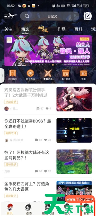 1、首先打开DNF助手软件,进入到首页中后我们可以看到一些资讯,我们在这里点击右下角的【我的】;