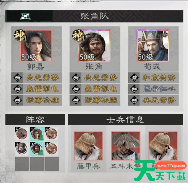 兵种站位:荀彧上方放置一个五斗米祭,并在郭嘉和张角的前方各放置一个藤甲兵。