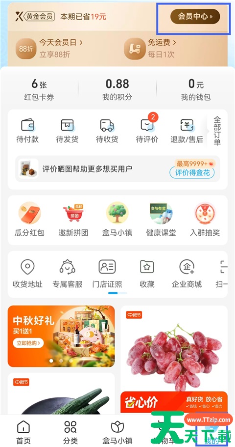 1、打开盒马鲜生app,进入【我的】界面,点击【会员中心】。