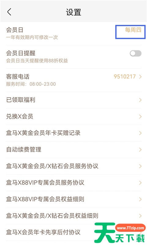 盒马鲜生app怎么更改会员日,打开盒马鲜生app,进入【我的】界面,点击【会员中心】,点击设置标识,点击【会员日】,选择星期进行修改即,会员日在一年的期限内只能更改一次。