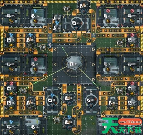 天王坪主要生产稳定炭块,其余生产线都在主基地。可自行调整替换需要的产线,比如替换针剂产线为装备之类。