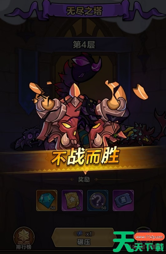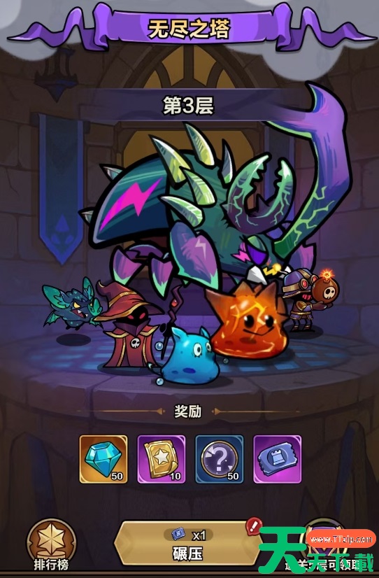 无尽之塔中的关卡战斗与普通关卡类似,都可让各位挑选技能词条来组建出自己的技能组,且只要将该层内的怪物全部清理掉,便能赢下本层关卡的挑战。同时,游戏还设计了很贴心的减负机制,要是玩家当前的战力超过要挑战的层数很多时,则可直接通过碾压来实现不战而胜,可立刻前往下一层继续自己的挑战之旅,直至自己的战力与要挑战的层数相差不大时,才会结束碾压。通过碾压获得的奖励与进入战斗获胜没有区别。