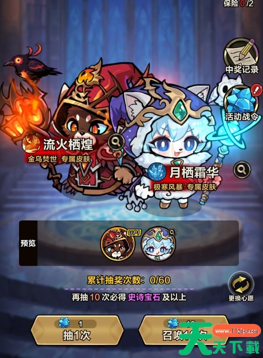 玩家能通过冰火之歌抽取极寒风暴和金乌焚世这两个技能的专属时装,其中极寒风暴的时装为月栖霜华,金乌焚世的时装为流火栖煌,玩家抽取时可任选其中之一为UP时装,提升抽取时该时装的出货概率。每次抽取都需要消耗一枚专属抽取道具蓝水晶,它可从抽取活动战令中获得,也能直接用200钻石来进行兑换。同时,冰火之歌有着保底机制,至多60抽就能让玩家获取其中一套时装,若上了保险则必定能抽取出自己的心愿时装。