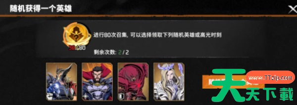 卡池的机制其实会有所区别,如果是选择普通奖池,那就有一个80抽保底的机制。在抽完80次之后就可以获得随机的三星角色卡,又或者是金色高光时刻卡。在40抽之后就能有机会获得稀有卡牌。并不需要担心一直抽不到好东西,关键的是普通的奖池还会有两次保底的机会,可以拿到三星角色或者是金卡。对新手来说是比较友好的,一开始靠普通奖池就可以获得很多的英雄。活动奖池更有针对性,例如在这里就可以拿到钢铁侠又或者是雷神。保底的次数要比普通奖池少了一些,只有一次80抽保底三星角色的优势。