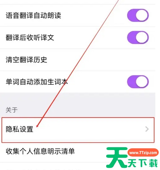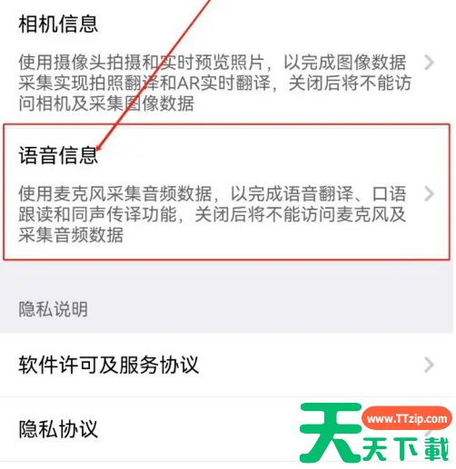 第一步: 打开【腾讯翻译君】APP进入软件页面; 第二步: 点击【设置】页面上的【隐私设置】选项进入; 最后一步: 点击页面上的【语音信息】选项进入后即可设置。 @天天资源网TTzip 除特别注明外,本站所有文章均为 天天下载 原创,转载请注明出处来自 https://www.ttzip.com/219600.html