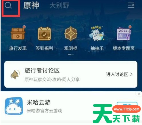 1.首先来到原神官方社区,点击上方的搜索。