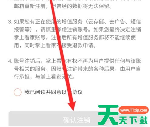 打开掌上看家点击右上角的设置按钮 进入账号管理界面点击‘注销账号’ 进入注销协议界面点击‘确认注销’ @天天资源网TTzip 除特别注明外,本站所有文章均为 天天下载 原创,转载请注明出处来自 https://www.ttzip.com/220139.html