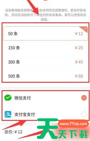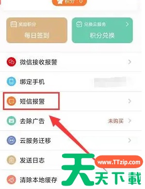 进入掌上看家,单击【我】选项。 在我页面,单击【短信报警】选项。 在短信报警窗口,选择购买套餐条数、支付方式,单击【确认支付】选项。 @天天资源网TTzip 除特别注明外,本站所有文章均为 天天下载 原创,转载请注明出处来自 https://www.ttzip.com/220147.html