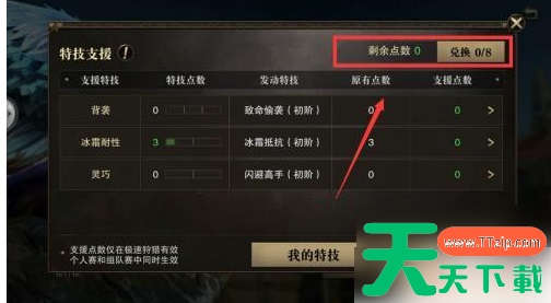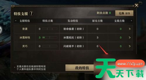 2.进入特技支援加点界面,每位玩家初始拥有8点特技点, 不过需要我们自己兑换。