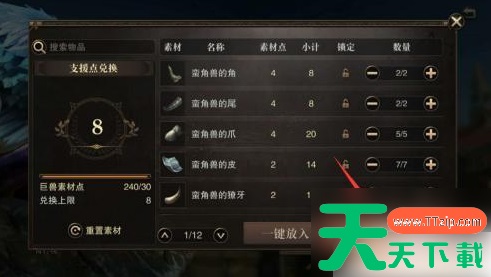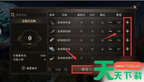 3.兑换支援点需要消耗巨兽素材,为了方便。我们可以点击【一键放入】,不喜欢系统自己匹配的也可以点击每项素材后面的【+】来设置数量。