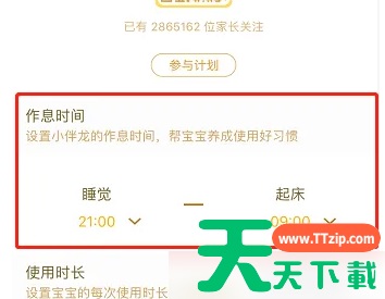 进入小伴龙欢迎页面。 点击左上角的脚印图标。 回答问题进行家长验证。 在家长中心点击休息管理。 在作息时间栏下,根据需要,设置小伴龙睡觉和起床的时间,点击确认即可。。 @天天资源网TTzip 除特别注明外,本站所有文章均为 天天下载 原创,转载请注明出处来自 https://www.ttzip.com/220180.html