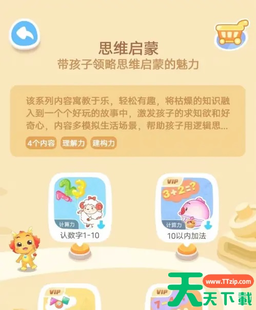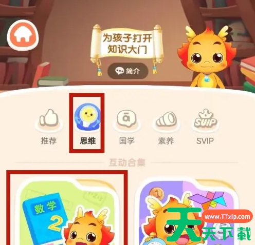 手机打开小伴龙软件,点击选择右下角学堂项目。 学堂页面,选择查看思维启蒙分类。 思维启蒙页面,根据提示做游戏,提交小伴龙完成启蒙。 @天天资源网TTzip 除特别注明外,本站所有文章均为 天天下载 原创,转载请注明出处来自 https://www.ttzip.com/220184.html