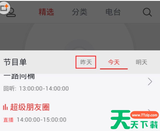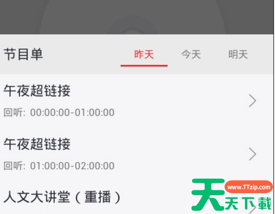 1、打开蜻蜓FM,进入想要回听的电台,然后点击界面左下角的“节目单”按钮;2、在“节目单”界面中,大家可以看到“昨天”“今天”和“明天”;3、然后点击“昨天”,就可以看到昨天的节目咯!@天天资源网TTzip 除特别注明外,本站所有文章均为 天天下载 原创,转载请注明出处来自 https://www.ttzip.com/220210.html