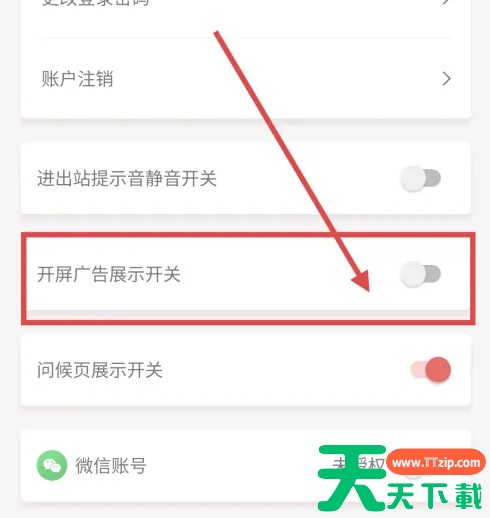 在手机上打开天津地铁app, 点击首页下方“我的”按钮, 点击“设置”按钮打开APP设置界面, 选择“账号管理”,点击打开, 找到“开屏广告展示开关”,关闭开关,设置完成。 @天天资源网TTzip 除特别注明外,本站所有文章均为 天天下载 原创,转载请注明出处来自 https://www.ttzip.com/220228.html