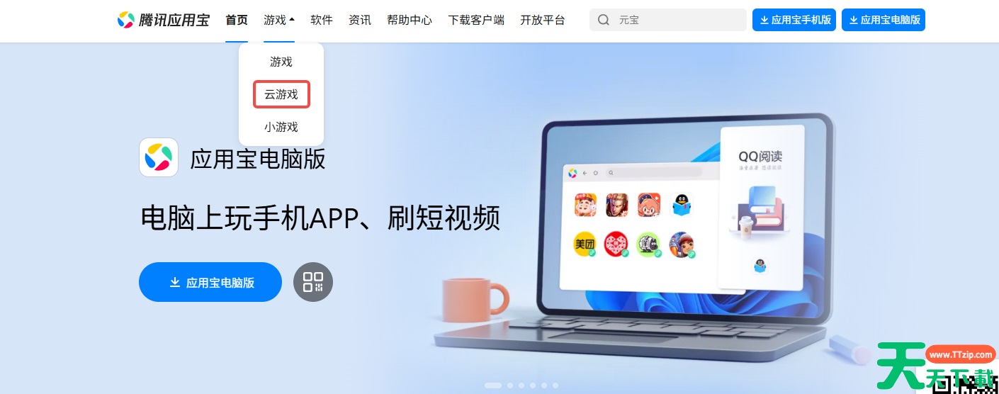 应用宝是由腾讯官方打造的安卓应用商店,也是国内非常受欢迎的应用下载平台之一。应用宝平台汇集了海量正版安卓应用和热门游戏,覆盖社交、娱乐、工具、办公、手游等多个类别,月活跃用户超过2亿,被很多安卓用户称为“应用百货商店”。与客户端不同,应用宝网页版还提供云玩功能。进入官网后,在顶部导航栏点击【云玩】,即可进入在线玩专区,实现免下载、即点即玩。