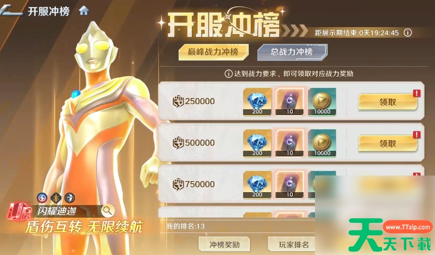 在9级时解锁【开服冲榜】玩法,只要达到战力要求,便能领取对应战力奖励。若玩家有幸进入到冲刺榜单中,游戏还会根据玩家在结束前的排名,发放【闪耀迪迦碎片】、【钻石】等奖励。