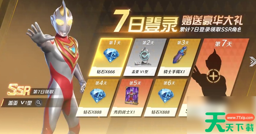 玩家6级时解锁,可在【福利】功能中的【登录赠礼】中找到。每天登录都能领奖励,能拿到【钻石】等资源,其中第二天可领取【V1型 盖亚奥特曼】,第七天可在【V1型 盖亚奥特曼】、【V1型 阿古茹奥特曼】、【强力型 迪迦奥特曼】、【希特拉】中任选一位,玩家可在第七天时,根据已有阵容来进行挑选。