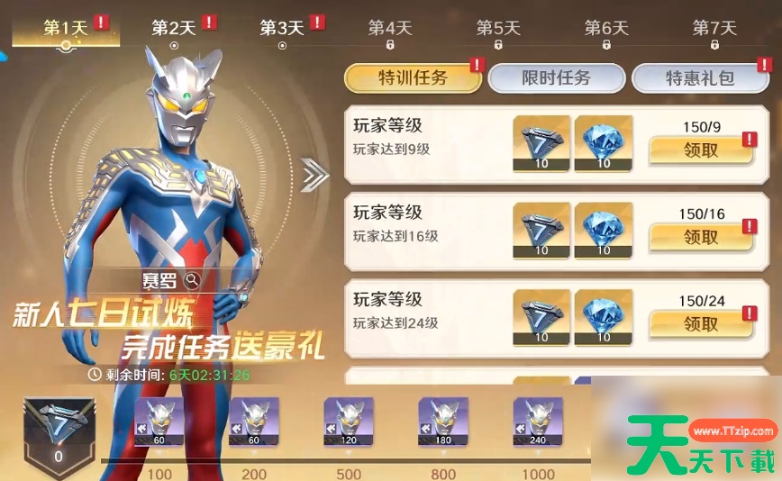 玩家6级时解锁,可在【福利】功能中的【开服福利】中找到。完成里边的任务可获得【活跃值】,用于领取各阶段的【活跃值奖励】,可拿到很多【赛罗奥特曼碎片】,用于合出赛罗奥特曼或为他升星。完成全部七日试炼中的任务,可领取【赛罗奥特曼突破宝箱】。该玩法存在着时限要求,开启后需在9天内做完。