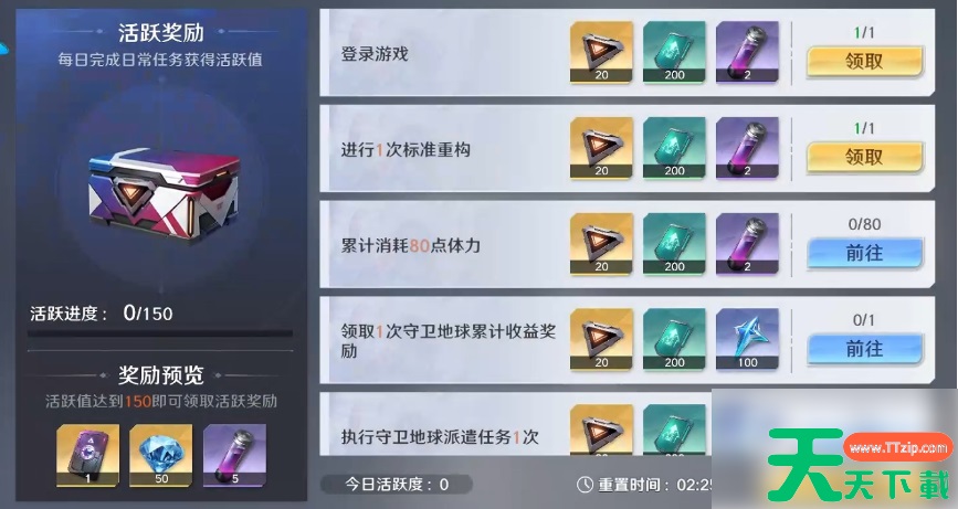 玩家等级9级时解锁,完成任务能累计【活跃进度】,可获得【能量重构卡】及各种资源奖励。
