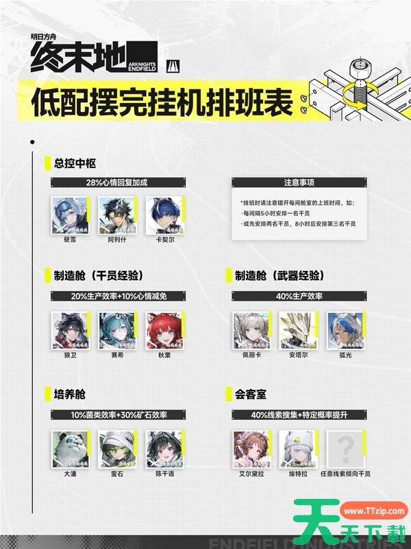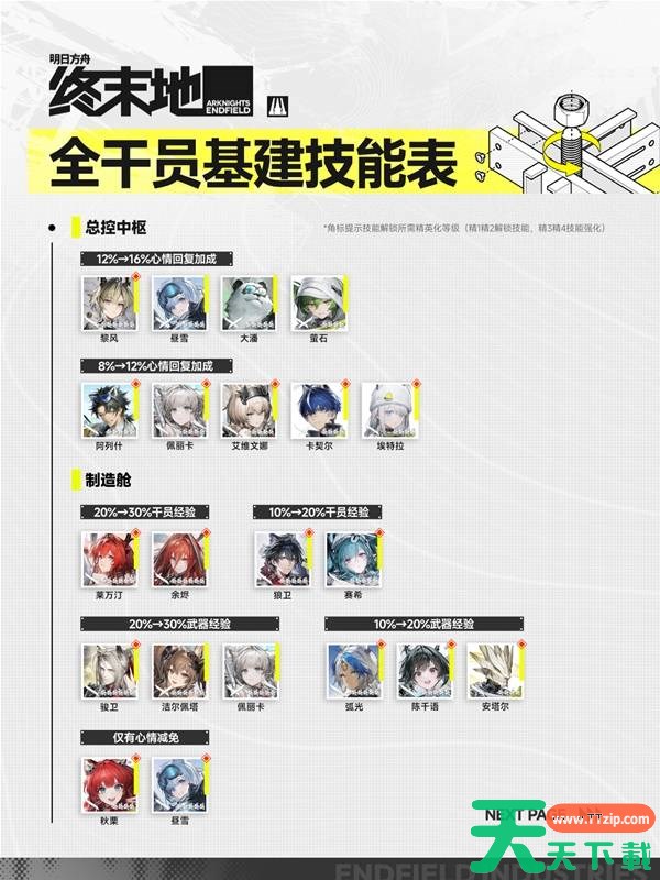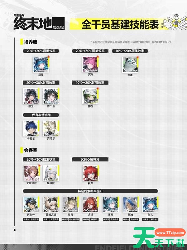 以上就是天天下载TTzip为大家带来的明日方舟终末地全干员基建技能一览的内容解读了,大家都了解了吗?还想要了解更多的内容那就请继续关注天天下载(ttzip.com)吧。
