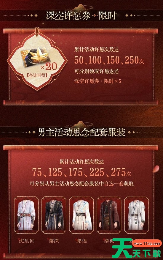 累计活动许愿达200次时,可在「沈星回·问剑观花」、「黎深·飞鸢坠春」、「祁煜·锦夜琢心」、「秦彻·千灯共我」、「夏以昼·晴昼当归」中自选一张获取。