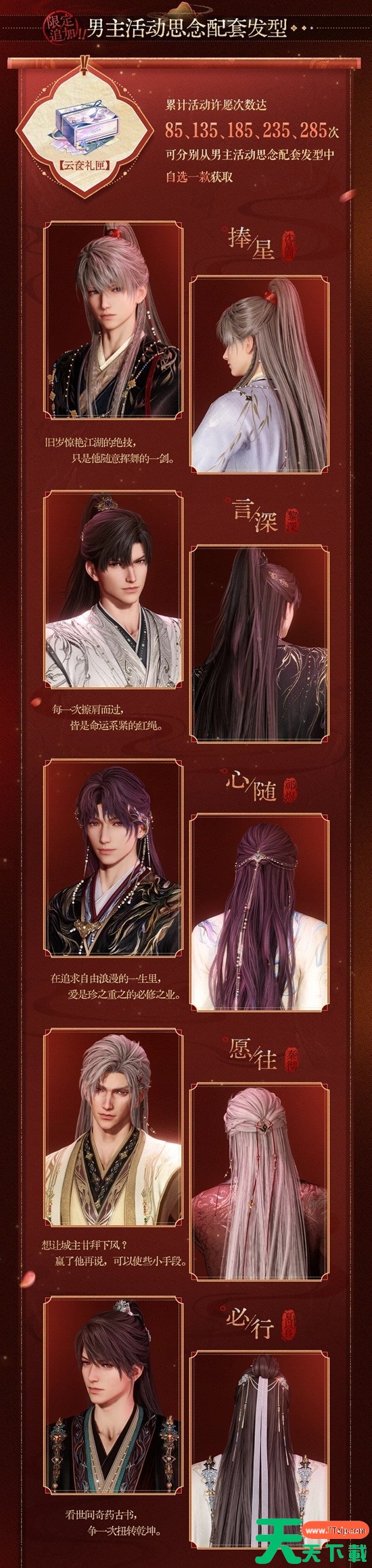累计活动许愿次数达85、135、185、235、285次时,可分别从当期男主「活动思念配套发型」中自选一款获取;