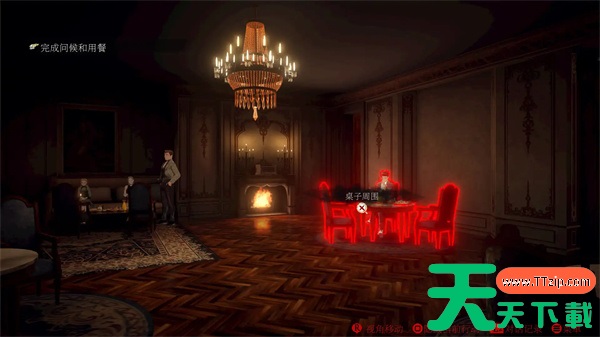 向克里斯托夫、洛琳和卡拉自我介绍。问问她是否紧张。场景结束后,是早餐时间,坐在壁炉旁。
