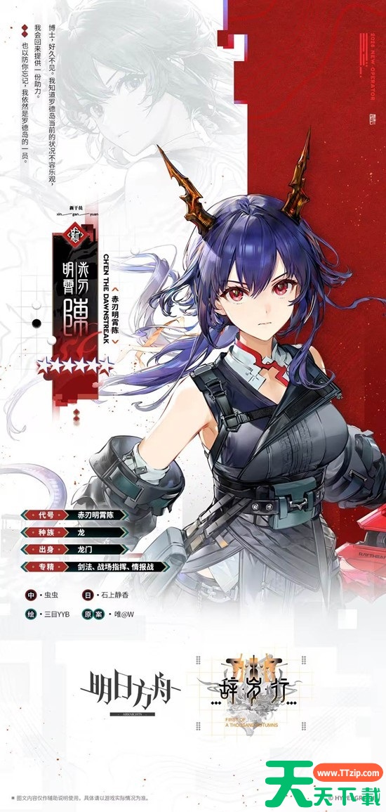 明日方舟将于近日的最新活动中推出全新六星干员,赤刃明霄陈作为近卫术战者分支的全新六星干员,有着较为强大的法术伤害输出,受到很多玩家的期待。今天天天下载Ttzip将为大家带来明日方舟赤刃明霄抽取建议,供感兴趣的玩家进行参考。