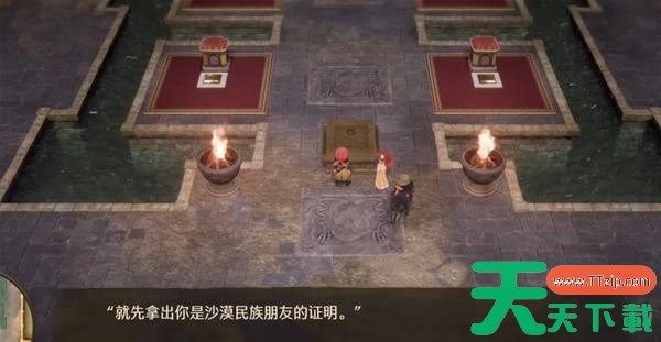 随后去下方石碑对话,要我们拿出沙漠民族朋友的证明,激活石碑之后四角的房间就都可以进入了。