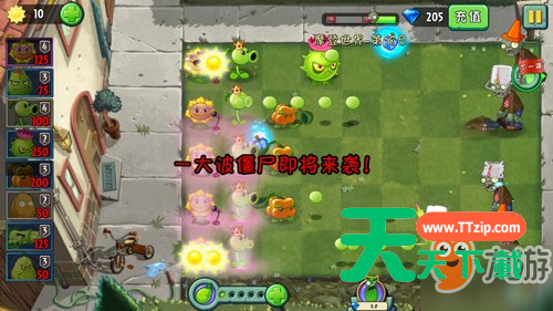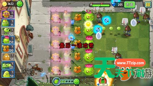 最后当一大波僵尸来袭的时候,给控场植物能量豆,这样能够帮助我们消灭大波僵尸。
