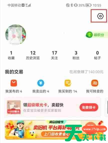 1、打开手机上安装好的闲鱼APP,进入“我的”页面,点击右上角的设置图标。