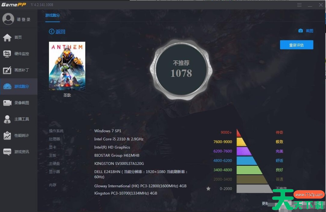 4、测试过程中会有短暂卡顿,完成后根据跑分结果给出运行建议。