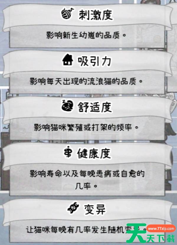 吸引力类似让野猫携带更好的属性跟技能,这项数值如果在100左右,可能会刷出最高自带3~4个天生7属性的猫咪,以及自带任意职业被动技能和一个任意职业的主动技能。