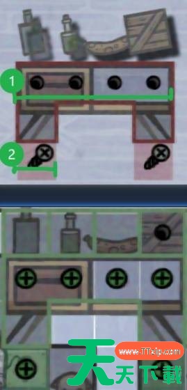 如图所示,家具的(1)提供了4个孔洞位置,能够让上面四个小物件的螺丝放进去,所以只要让这个桌子满足摆放条件(2)就可以额外获得新的4个位置摆放空间。