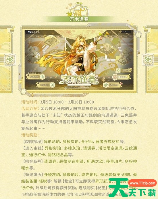 物华弥新2.7下版本活动万木逢春3月5日正式开启,本游戏新版本开启,很多玩家就可以去解锁全新的第七章章节来看了,一起来看看吧。